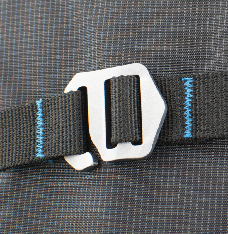 Odolné kovové háčky a Hypalonem podložená poutka na čele batohu k diagonální fixaci lyží.