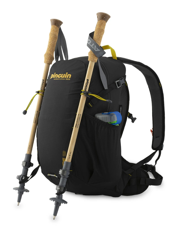 Pružná poutka s háčky na připevnění teleskopických holí a poutka na dně batohu. Boční síťované kapsy na lahve.