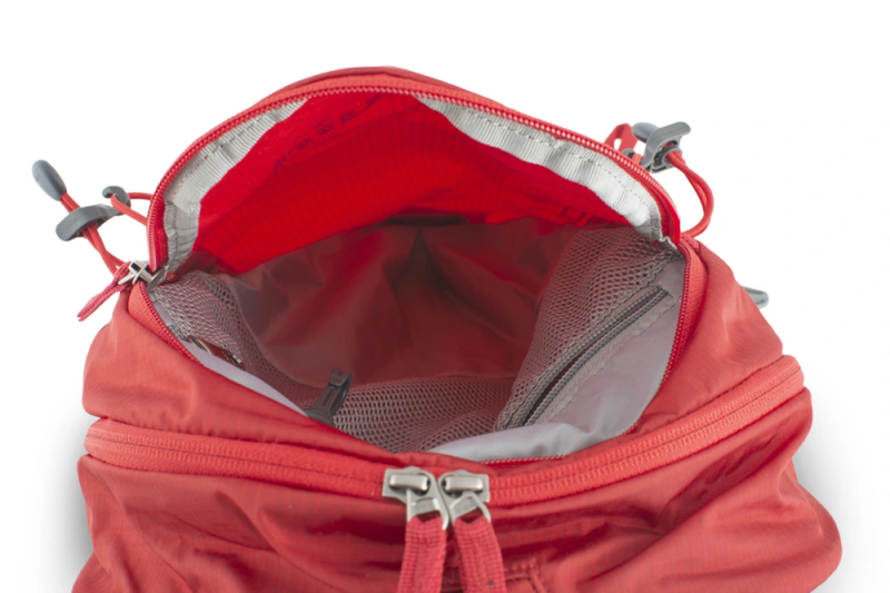 Prostorná čelní zipová kapsa s vnitřní síťovanou zipovou kapsou na cennosti s karabinkou na klíče.