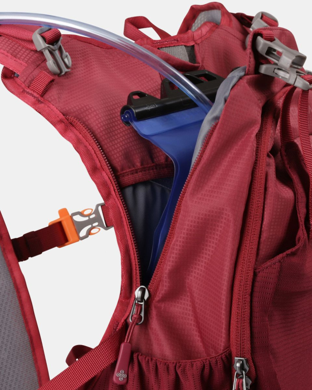Kilpi CADENCE 10-U je kompatibilní s vodním vakem, který se umísťuje do přihrádky na zádech a zafixuje pomocí suchého zipu. Hadička se upevňuje pomocí magnetického patentu na předním rameně a proto se s ní velmi lehce manipuluje. Přední zipová přihrádka obsahuje přehledný organizér, síťovanou kapsu na helmu nebo bundu v přední části a zipovou kapsu na drobnosti. Běžecké hole je možno uchytit pomocí gumiček. Další dvě kapsy jsou umístěny na bocích a pojmou láhev o objemu půl litru.