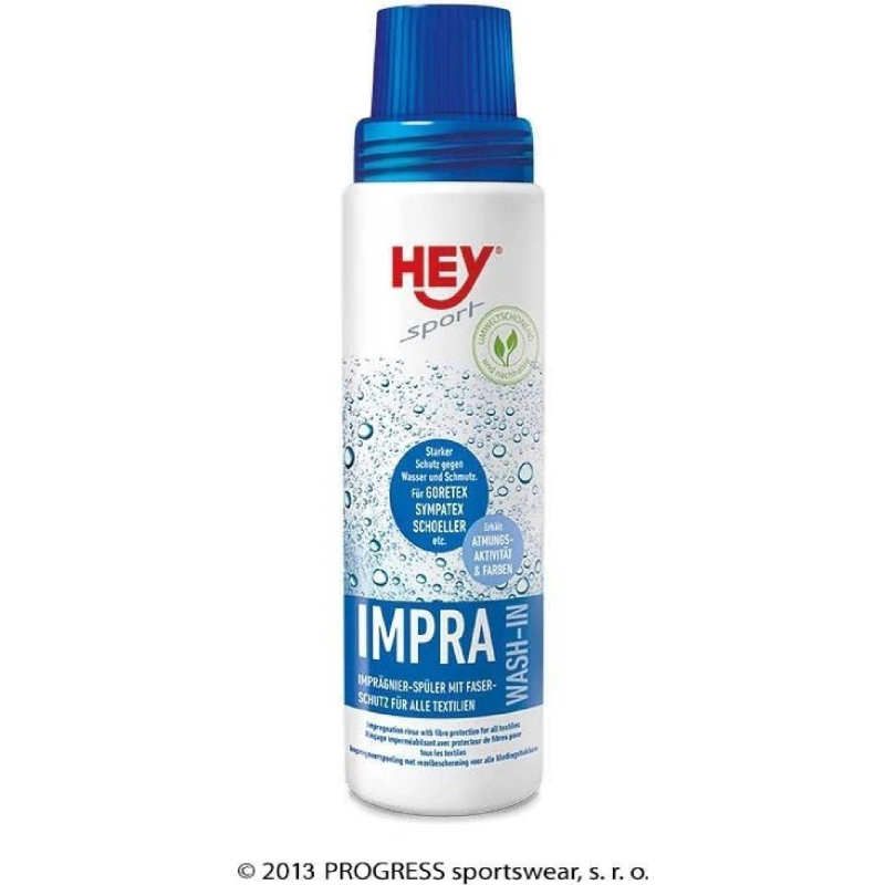 HEY SPORT® Impra Wash-In je impregnace, která se přidává k prádlu při praní a zajišťuje plnou ochranu proti vodě při zachování prodyšnosti.