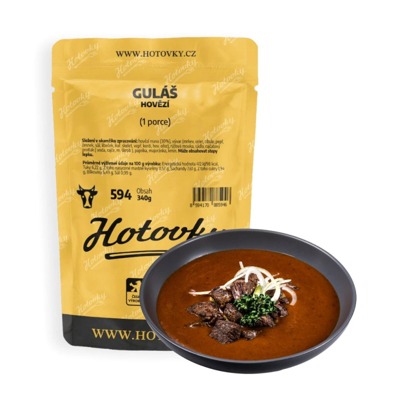 Složení v okamžiku zpracování: hovězí maso (30%), vývar (mrkev, celer, cibule, pepř, česnek, sůl, libeček, kuř. skelet, vepř. kosti, hov. ořez), rýžová mouka, sádlo, rajčatový protlak ( voda, rajče, m. škrob ), paprika, majoránka, kmín. Může obsahovat stopy lepku.