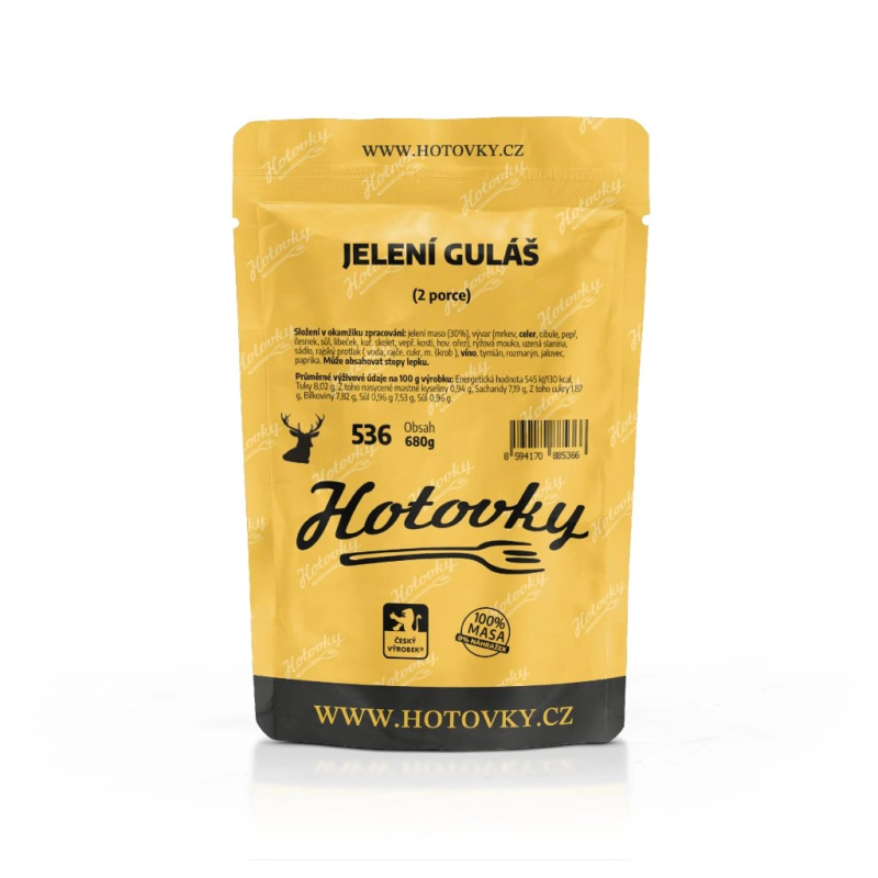 Zobrazit víceSložení v okamžiku zpracování: jelení maso (30%), vývar (mrkev, celer, cibule, pepř, česnek, sůl, libeček, kuř. skelet, vepř. kosti, hov. ořez), rýžová mouka, uzená slanina, sádlo, rajský protlak ( voda, rajče, cukr, m. škrob ), víno, tymián, rozmarýn, jalovec, paprika. Může obsahovat stopy lepku.