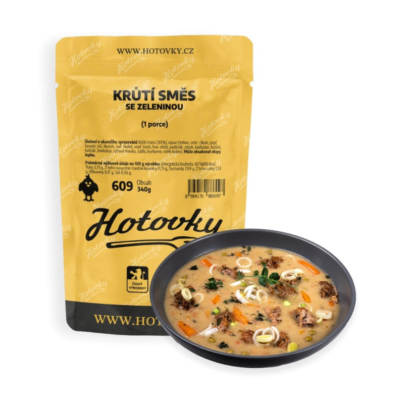Zobrazit víceSložení v okamžiku zpracování: krůtí maso (30%), vývar (mrkev, celer, cibule, pepř, česnek, sůl, libeček, kuř. skelet, vepř. kosti, hov. ořez), pastinák, pórek, kedluben, hrášek, květák, brokolice, rýžová mouka, sádlo, kurkuma, směs koření. Může obsahovat stopy lepku.