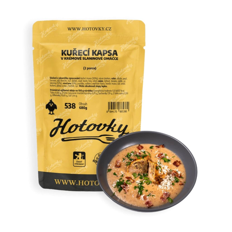 Složení v okamžiku zpracování: kuřecí maso (30%), vývar (mrkev, celer, cibule, pepř, česnek, sůl, libeček, kuř. skelet, vepř. kosti, hov. ořez), vejce, rýžová mouka, sádlo, uz. slanina (12%), smetana (6%), paprika, salám ( vepřové maso, hovězí maso, sůl, směs koření, pitná voda.), hrášek, sýr. Může obsahovat stopy lepku.