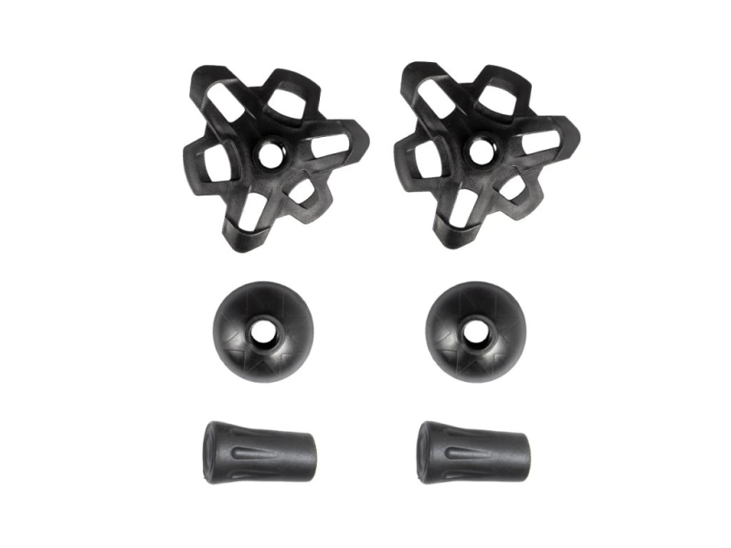 Ocelové hroty. Hole jsou dodávány se dvěma talířky. Velký je speciálně tvarovaný do hlubokého sněhu a zároveň aby nepřekážel při chůzi.