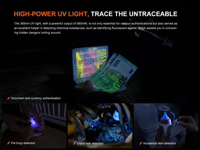 - Jsou použity dvě bílé LED Luminus SST-12, UV dioda s vlnovou délkou 365 nm Luminus SST-08 a červený laser třídy 1, vše s životností 50 000 hodin.