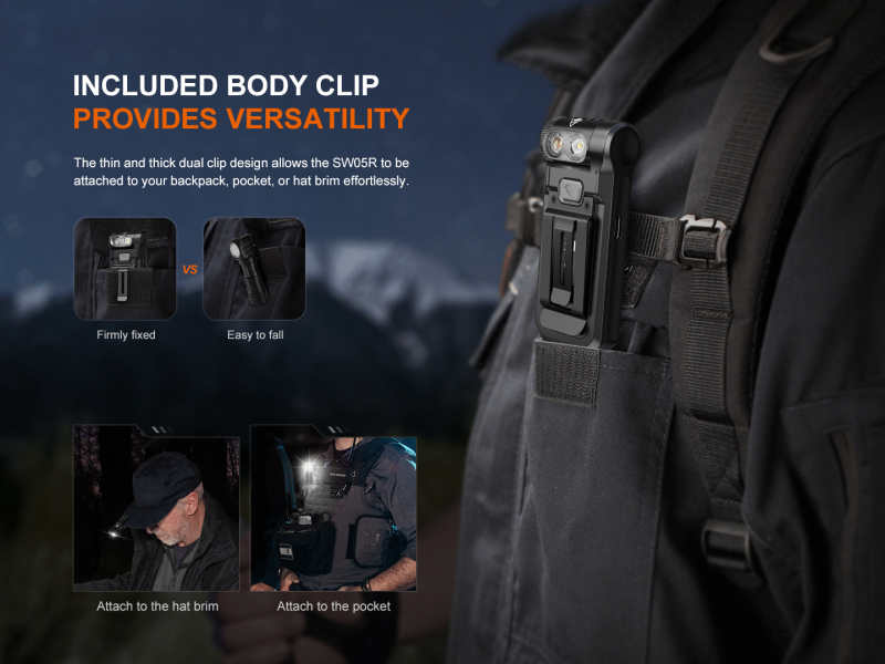 Fenix SW05R-UV je multifunkční svítilna s otočnou hlavou, kompaktními rozměry a hmotností pouhých 55 gramů. Nabízí světelný tok až 150 lumenů (ANSI). Světelný kužel rovnoměrně osvětluje široký prostor do vzdálenosti až 39 metrů. K napájení slouží integrovaný akumulátor s kapacitou 700 mAh, který se nabíjí přes moderní USB-C konektor na boku svítilny. K dispozici jsou celkem tři režimy bílého světla a UV světlo s vlnovou délkou 365 nm o síle 1500 mW. Svítilna je dodávána včetně pevného klipu, takže ji můžete uchytit na kapsu, popruh batohu či kšilt čepice a uvolnit si tak při svícení ruce. Díky magnetu v patce svítilny ji můžete přichytit k čemukoli železnému. Hlava s diodami je otočná v rozsahu 200 stupňů. To činí svítilnu v kombinaci s možnostmi uchycení velice praktickou. SW05R využijí zejména policisté a další profesionálové ve službě a při práci, ale skvělá je i pro EDC. Díky malým rozměrům, plochému tvaru a váze ji můžete mít stále u sebe.