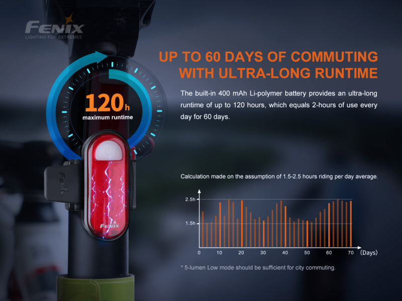 Design držáku umožňuje rychlou montáž i demontáž světla na kolo bez použití nářadí. Objímka pasuje na sedlovou trubku s průměrem 20 až 35 milimetrů. V režimu rychlého blikání s výkonem 5 lumenů dosahuje výdrž svítilny až 120 hodin, Fenix BC05R V2.0 vám zajistí bezpečné osvětlení na noční tréninky, pravidelné dojíždění do práce i na vytrvalostní závody.