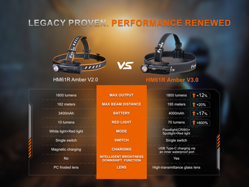 Koncovka čelovky je magnetická, takže ji lze snadno uchytit na cokoliv železného. HM61R Amber V3.0 disponuje čtyřmi režimy osvětlení pro každý reflektor, což umožní volit mezi vysokým výkonem a dlouhou výdrží (až 400 hodin). Svítilna je napájena digitálně kontrolovaným konstantním proudem pro zaručení stálého světelného výkonu i při snižování napětí v bateriích (při jejich pozvolném vybíjení).