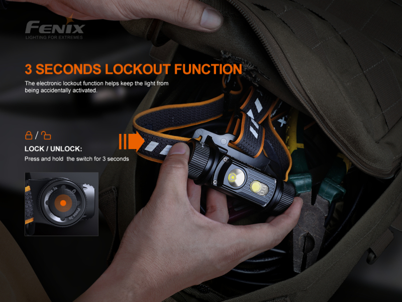 Uzamknutí čelovky proti nechtěnému zapnutí: Povolte bateriový uzávěr čelovky o čtvrt otáčky, přeruší se tím elektrický kontakt a čelovku nelze zapnout. Tlačítko lze uzamknout i elektronicky – při vypnuté čelovce podržte tlačítko stisknuté po dobu 3 vteřin. Po uzamknutí svítilna červeně zabliká. Pro odemknutí opět tlačítko 3 vteřiny podržte.