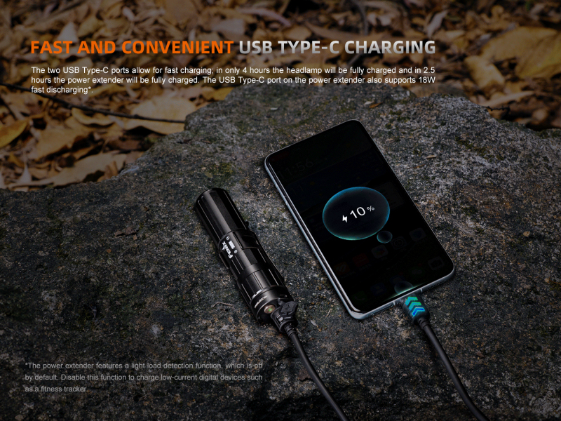 - Nabíjení přes vodotěsný USB-C konektor na čelovce a zadním bateriovém pouzdře/powerbance.