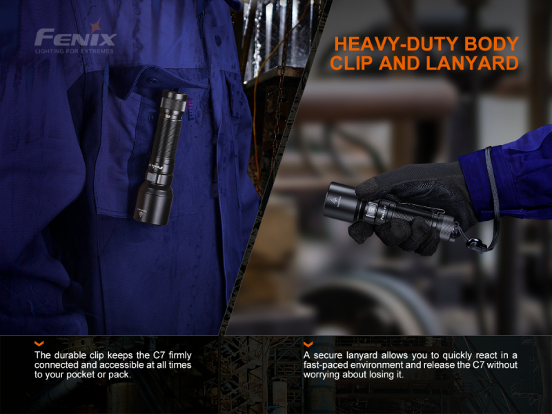 Výborného výkonu bylo dosaženo použitím moderní LED Luminus SST-70. K napájení slouží vysokokapacitní Li-ion akumulátor typu 21700 s kapacitou 5000 mAh (součást balení), který se nabíjí přímo ve svítilně přes moderní USB-C konektor. Svítilna byla navržena s ohledem na jednoduchost ovládání a širokou použitelnost. Sedm světelných funkcí umožňuje zvolit mezi vysokým výkonem a dlouhou výdrží bezmála tří dnů. K dispozici je i oslepující stroboskop a signál SOS pro nouzové situace. Fenix C7 je napájena digitálně kontrolovaným konstantním proudem pro zaručení stálého světelného výkonu i při snižování napětí v bateriích (při jejich pozvolném vybíjení). Zapnutí i přepínání režimů je velice jednoduché a provádí se tlačítkem ergonomicky umístěnými na boku. Koncovka svítilny je magnetická, takže ji lze snadno uchytit na cokoliv železného. Svítilna je ideálním světelným nástrojem s vynikajícím poměrem vysokého výkonu, kvality a ceny. Svou univerzálnosti ji lze doporučit jak pro práci v průmyslových odvětvích, do domácí dílny, ale zároveň je to ideální outdoorový parťák pro turistiku a různorodé sportovní aktivity.