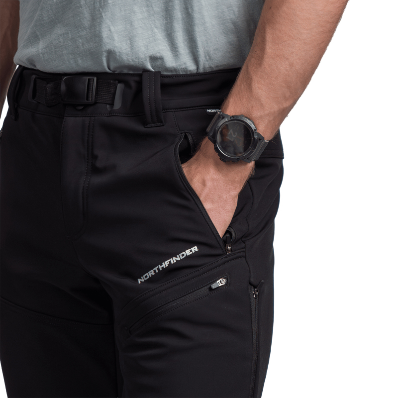 Softshell je ošetřen ekologickou vodoodpudivou úpravou DWR bez sloučenin PFC, která zajišťuje stékání vody a nečistot z povrchu. Předtvarovaná kolena a všitý nastavitelný pásek spolu s poutky pro další pásek dodávají pohodlí i při náročných túrách. Kalhoty mají dvě boční kapsy, jednu zadní a jednu stehenní kapsu se zipem, což umožňuje praktické uložení potřebných věcí.
