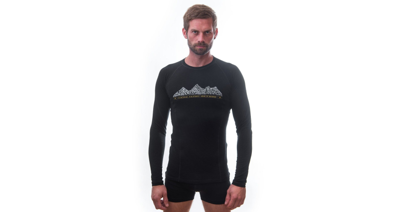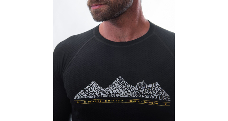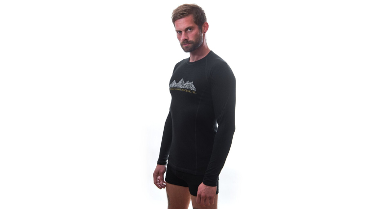 Tričko s dlouhým rukávem a potiskem vyrobené z úpletu unikátní konstrukce kombinující polyester na vnitřní straně a vysoce kvalitní Merino vlnu z Nového Zélandu.