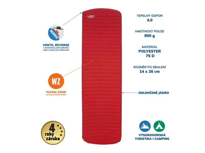 Na tento produkt se vztahuje prodloužená záruka (4 roky). Karimatka je dodávána s přepravním obalem a sadou na opravy. Kapsička na sadu na opravy je uvnitř obalu, aby nedošlo k jeho poškození nebo ztrátě.