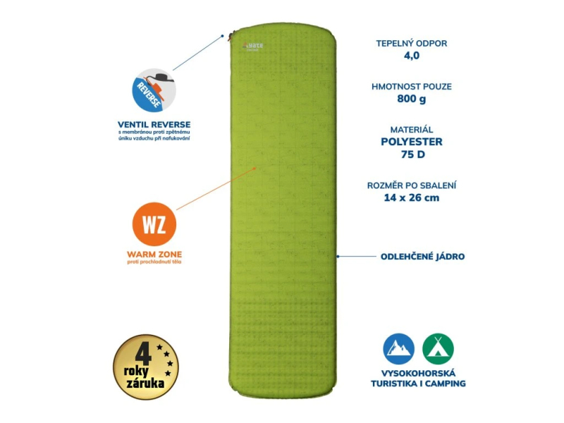Na tento produkt se vztahuje prodloužená záruka (4 roky). Karimatka je dodávána s přepravním obalem a sadou na opravy. Kapsička na sadu na opravy je uvnitř obalu, aby nedošlo k jeho poškození nebo ztrátě.