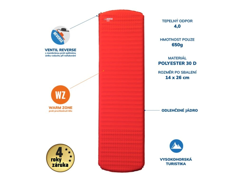 Na tento produkt se vztahuje prodloužená záruka (4 roky). Karimatka je dodávána s přepravním obalem a sadou na opravy. Kapsička na sadu na opravy je uvnitř obalu, aby nedošlo k jeho poškození nebo ztrátě.