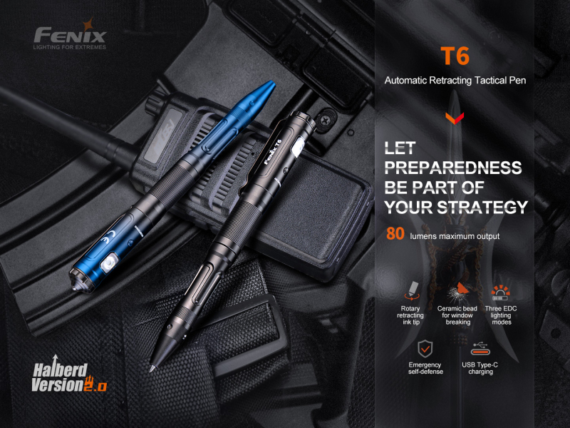 Fenix T6 je kombinací taktického pera a svítilny, která poskytuje světelný výkon až 80 lumenů a dosvit až 18 metrů.